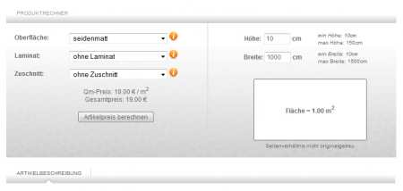 Ihr Kunde hat die Möglichkeit einfach die gewünschten Abmessungen von Werbebannern, Planen, Holzzuschnitten usw. einzugeben. Der Artikelpreis wird sofort aktualisiert. Nach der Auswahl der Attribute wird durch diese automatische Preisaktualisierung der neue Gesamtpreis angezeigt.